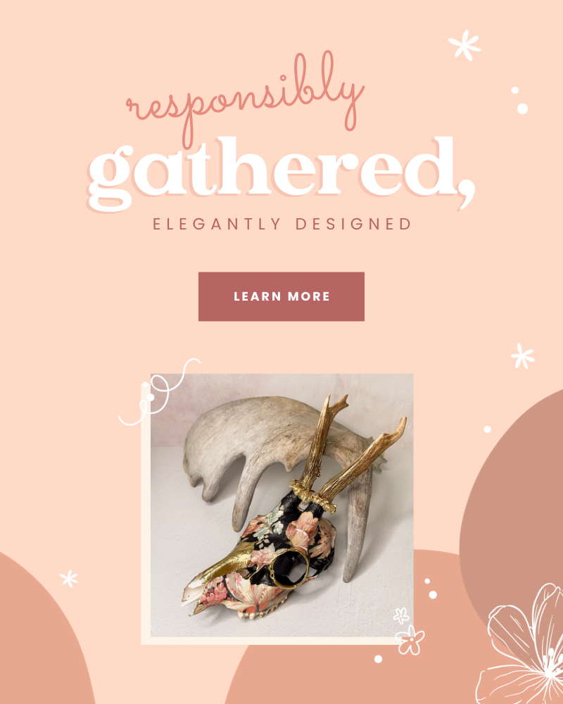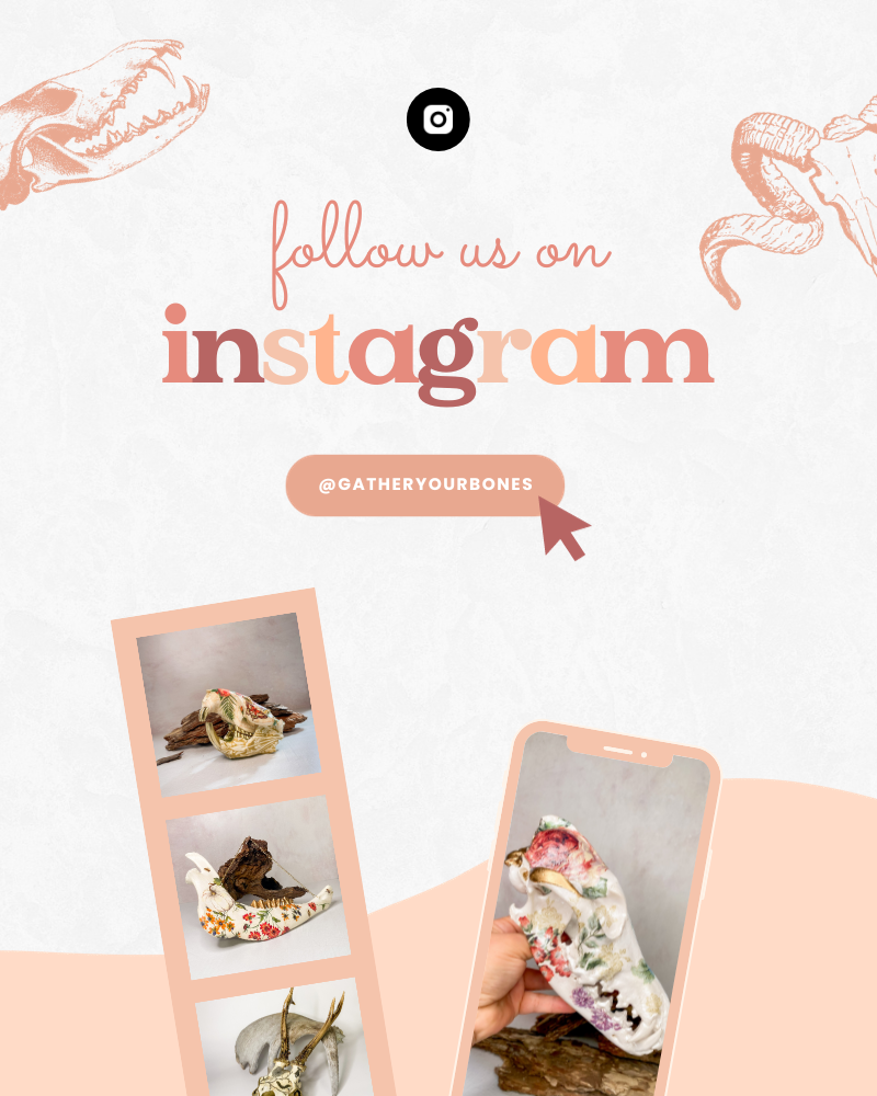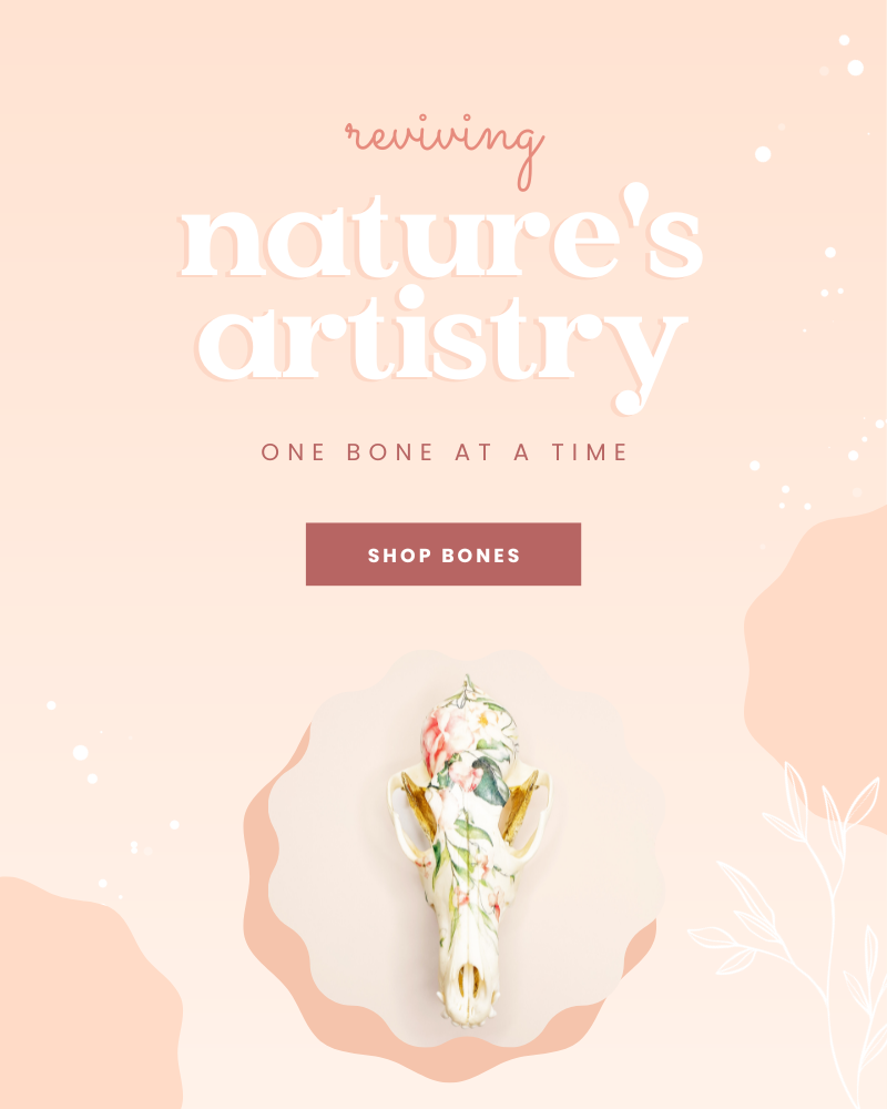 True artistry is born from a deep connection to the world around us. The passion of Gather Your Bones lies in the loving creation of unique pieces that capture the ethereal spirit of the natural world. We respectfully gather each bone and skull, breathing new life into them through mixed media techniques.